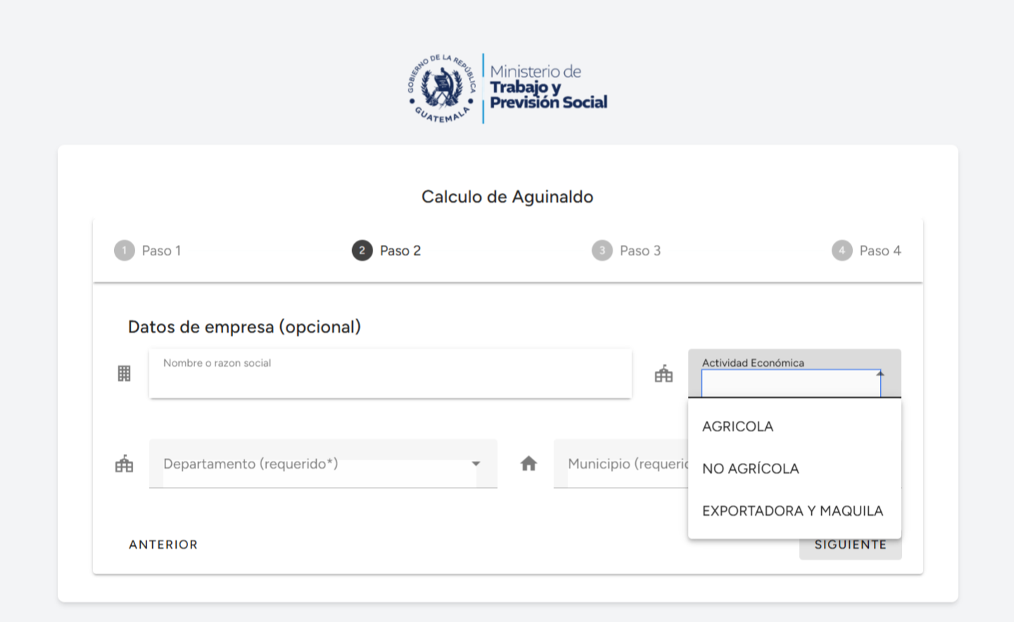 - Selecciona el departamento y municipio, ya que el salario mínimo depende de la ubicación.