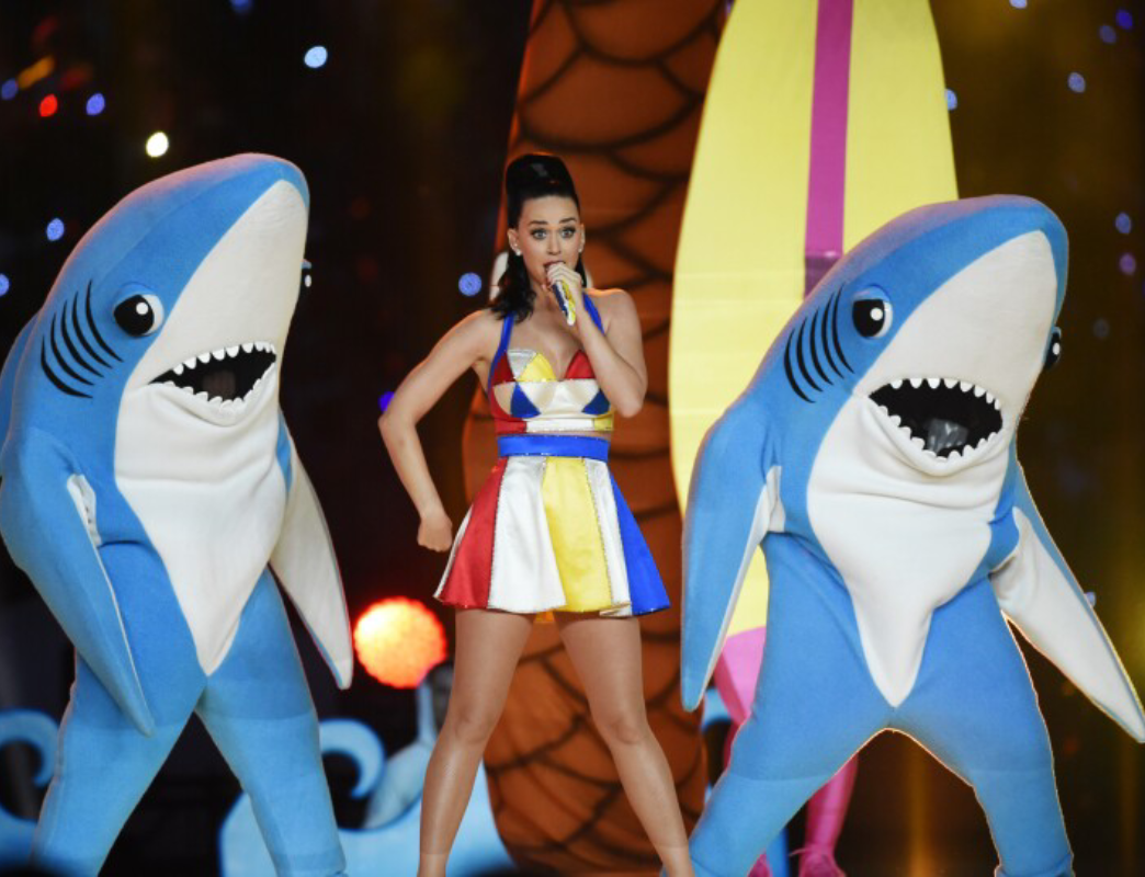 Su show de 13 minutos se convirtió en un fenómeno viral. Con entrada sobre un león mecánico, cambios de vestuario y los famosos “tiburones bailarines”, Katy Perry combinó espectáculo visual y música pop, alcanzando 118.5 millones de espectadores, récord en ese momento.